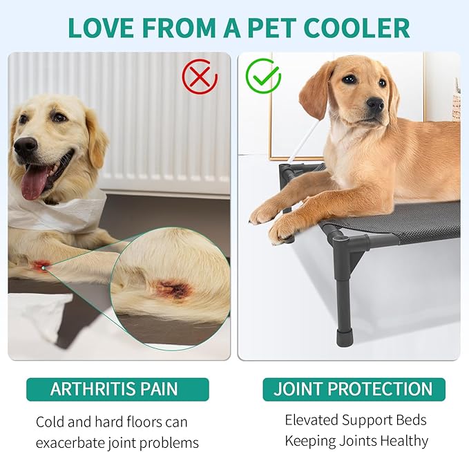 - 🐕Pets stay cool in summer: Our dogs will stay cooler if they sleep on a raised dog bed in breathable mesh fabric than if they sleep on a blanket or mat. That's because the dog bed lifts your pet 8 inches off the ground to promote good airflow, dissipate heat, and prevent odor buildup. This cooling effect is a valuable benefit of a dog hammock, especially in warm weather or hot areas. Plus, wet dogs dry really fast on raised mesh fabric beds!