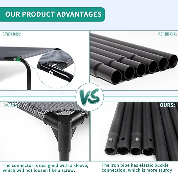 - 🐕DURABLE DESIGN: The well-built frame helps the pet bed be stable and safely raised, allowing your dog to rest easily - even if your dog uses it as a trampoline, the non-slip feet add extra stability, bouncing up and down in the air! Additionally, our outdoor dog beds are extremely lightweight and easy to move, providing real comfort for dogs in unfamiliar environments.
