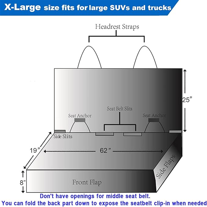 - X-Large SIZE -52" L × 62" W x-largel size for larget vehicles such as large SUVs and trucks. You can measure your car seat's width first and compare to ours