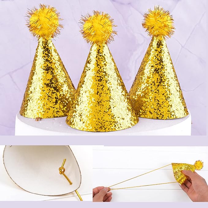 - Dog Birthday Hat: the birthday hat is made of gold glitter paper, wool balls and rubber bands. The length of the rubber band can be adjusted, which can be applied to dogs with different head circumference.