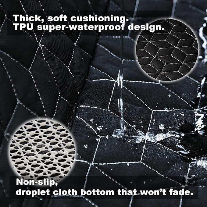 - 【Protect Your Truck Interior】Our pet seat cover is made of 600D Oxford fabric, 100g PP cotton, 210D polyester fabric, and 100% waterproof TPU. The durable material prevents your dog from scratching the car seats. Installing the back seat pet cover for dogs can prevent pet hair from getting into the seat crevices while also protecting the car interior from pet urine damage.