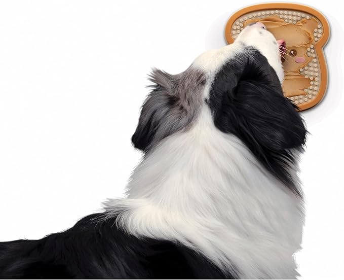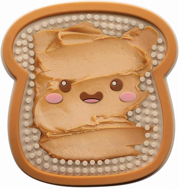 - UNIQUE DESIGN: Simply spread peanut butter (or similar spreadable snack) on the “bread” and adhere to any smooth surface with five strong suction cups. Food settles in the mat’s surface which slows the feeding dramatically and prolongs enjoyment.