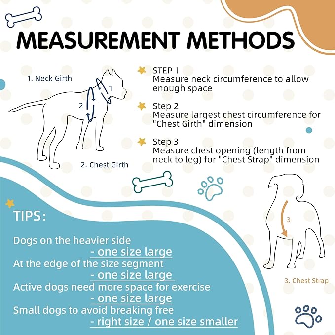 - 【4 Sizes Option】Pawhuggies no pull Dog harnesses are available in 4 sizes. Please wrap the tape around the widest part of your dog's torso to measure the Chest Girth. Right behind the front legs. For the comfort & fit of your pet remember to leave some space between dog and dog harness