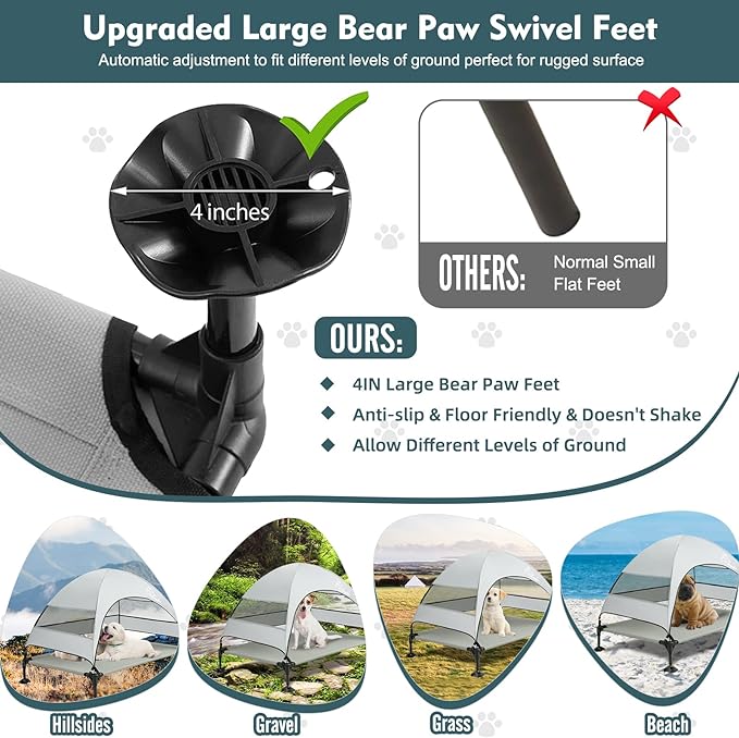 - Super Stable Elevated Dog Bed with Unique Bed Feet: We call these unique bed feet "Bear Paw" or "Lotus Leaf", 4' wide to create large area with ground, special bottom structure to increase grip, it stands much more stable than normal pet beds. With a joint ball holding each foot and post, the feet can automatically adapt to different levels of grounds, thus to stand still on rugged grounds beach, hillsides, grass, gravel and almost anywhere you'd paced it! Even when dogs roll around!