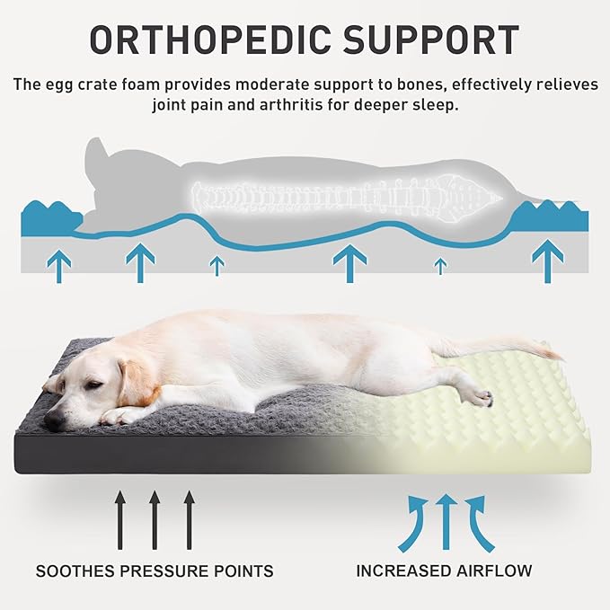 - Orthopedic Support - Our dog crate bed equips a 3-inch thick high-density egg crate foam. The excellent elasticity supporting and long-lasting recovery ability comfort our dogs with strong support to bones and joint, effectively relieve joint pain and arthritis. This dog bed is especially suitable for puppies and older dogs.