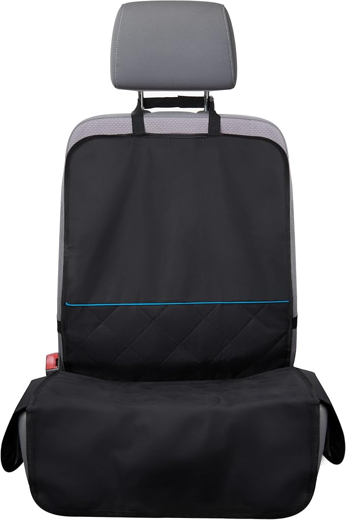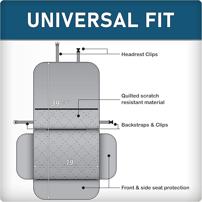 - ADJUSTABLE STRAPS: Sturdy straps buckle securely behind the front and rear headrests to keep the protector in place