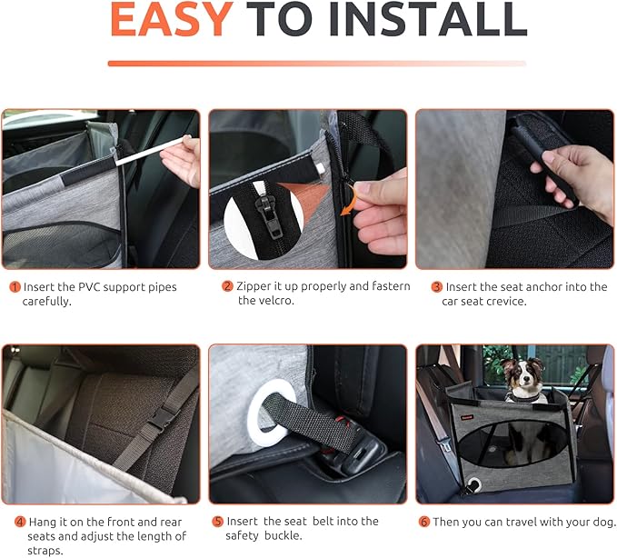 - 【 Easy to Assemble 】Follow the instruction in the package,you can set up this dog car seat very quickly.Don't forget to insert the seat anchor into the back seat to reinforce its stability and it can also be used as a carrying handle when the puppy car seat is folded up.