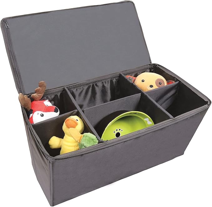 - ADDED BONUS STORAGE - Car seat extender for dogs provides added storage space that a backseat pet bridge can't. Platform box opens to reveal a large storage area with adjustable dividers to keep you pet's travel essentials organized. A convenient side pocket keeps leashes stowed away.