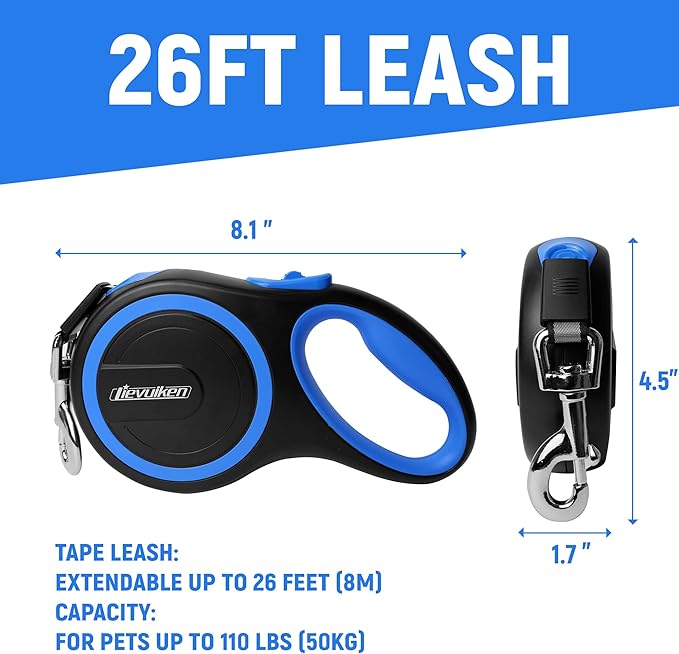 - Retractable dog leash that extend to 10/16/26 feet. 10FT leash is suitable for dogs up to 33 lbs. 16FT leash is suitable for dogs up to 44 lbs. 26FT leash is suitable for dogs up to 110 lbs. The rope is durable and not easy to break. Comfortable grip design in line with the comfortable grip design, long time holding hands won't be tired