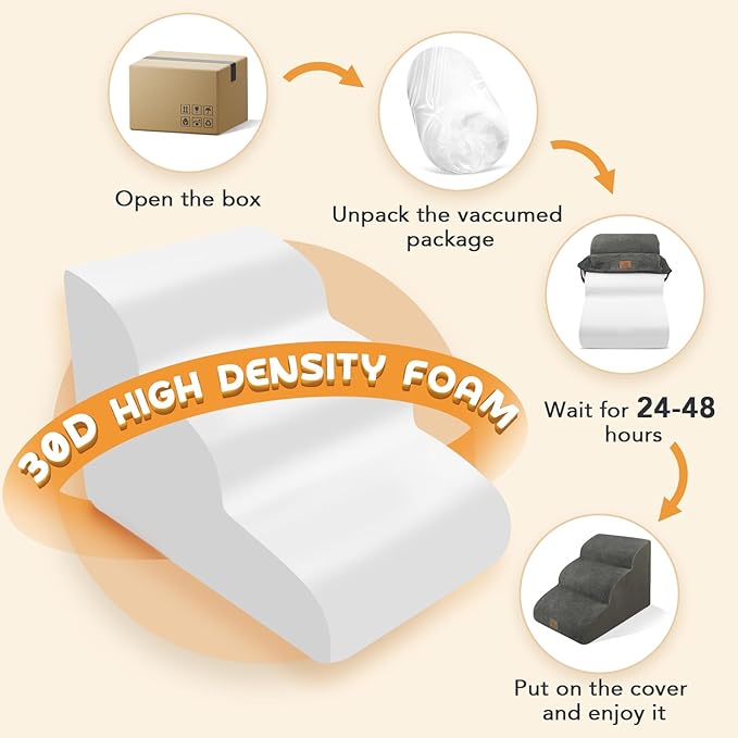 - VACUUM COMPRESSION PACKING: The stairs adopts vacuum compression packing, so please take the foam base out and wait for 24-48 hours until it restores original shape. No tools are required to install. Lightweight material is convenient to carry and use both indoor and outdoor.
