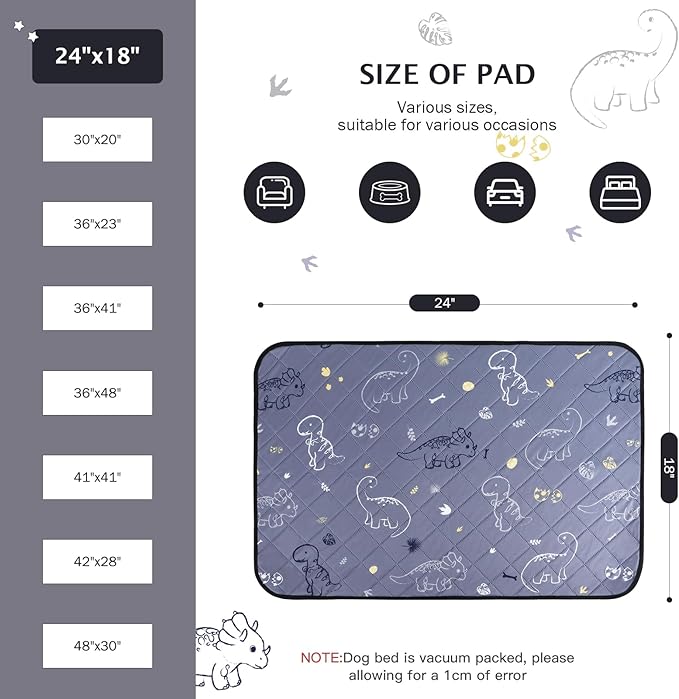 - 【Fashion and Non-slip】 Our dinosaur design makes this reusable pee pads for dogs very cute and makes your room more stylish. And the soft and comfortable puppy pee pads with anti-skid bottom can achieve a certain fixed effect.The bottom is waterproof and you can place it anywhere you want.