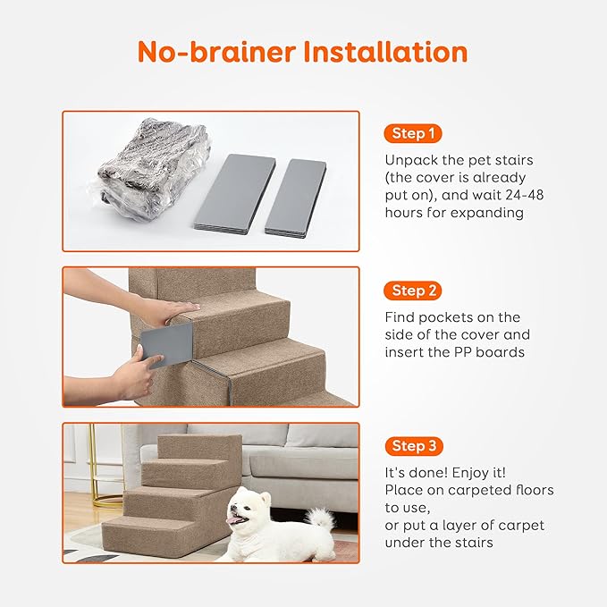 - Keep Your Pets Safe: Our pet stairs undergo rigorous safety testing to ensure they can handle even the most active pets. Constructed from high-quality foam and innovative medium density boards, our foolproof design won't deform or collapse under the weight of excited pets. Featuring an anti-skid base, our stairs offer maximum grip to prevent falls. Note: The product has undergone vacuum compression, please ensure complete expansion before using it for your pet