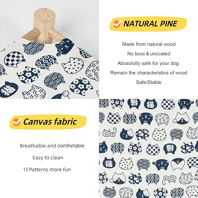• MATERIAL: Patas Lague cat and dog hammock bed consists of linen fabric and natural wooden frame. The fabric is breathable enough to promote airflow and makes puppy feel cooler in hot weather. Sturdy frame provides more stable support, preventing the bed from shaking or tipping over.