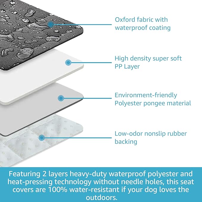 - 2 LAYERS HEAVY-DUTY 100% WATERPROOF: Featuring 2 layers heavy-duty waterproof polyester and heat-pressing technology without needle holes, Lassie back seat cover for car seats can stand up against whatever your pooch throws it, from lake water, muddy paws, drooling to liquid messes. Two side flaps cover the sides of your car seat and make it easier for your pet to get in and out of the car without damage your car seat.