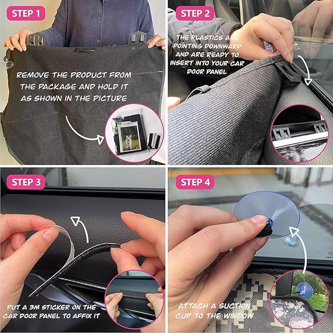- FAST & CONVENIENT INSTALL: These door cover provide 3 ways to give you a safe driving experience. 1. Insert the tabs into the window gap. 2. Use the 3M glue to fix the car door cover and there don’t have trace when you remove the glue. 3. Attach suction cups to the window. Only takes 60 seconds, you will be ready to go!
