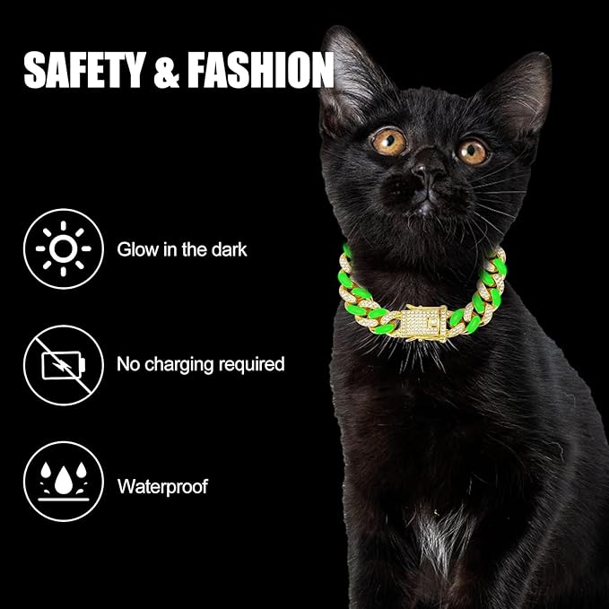 - 【NICE GIFT CHOICE FOR PET】Dogs and cats are our best friends,you can use this cuban dog collar chain to dress up your pet in their birthday or other special holidays,like Christmas,NewYear and etc.( Attention: It is normal for the product to have no fluorescence in the dark when it is first received, and it will become brighter and brighter after full contact with natural light.)