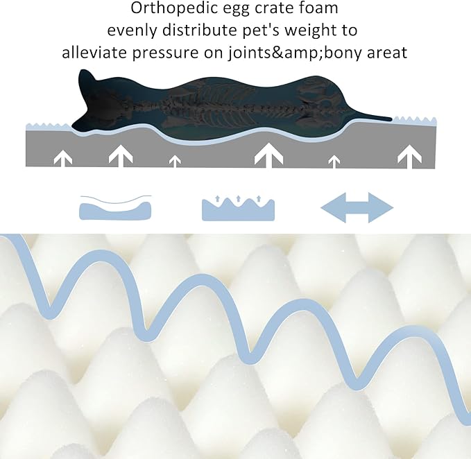- THICK EGG CRATE FOAM - Our dog bed filled with 4 inch high-resilient foam that is specifically engineered to optimize comfort and alleviate pressure points, ensuring optimal bone support and overall well-being.