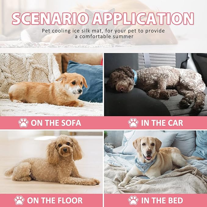 - Multi-Use - Lightweight and folds effortlessly, unlike most dog cooling mats on the market. No water or refrigeration needed; simply place the mat on the floor or sofa and let your pet enjoy. The ice silk mat absorbs your pet's body heat, providing a cooling effect on contact. Versatile use on sleeping beds, kennel mats, car seats, lawns, beaches, and more.