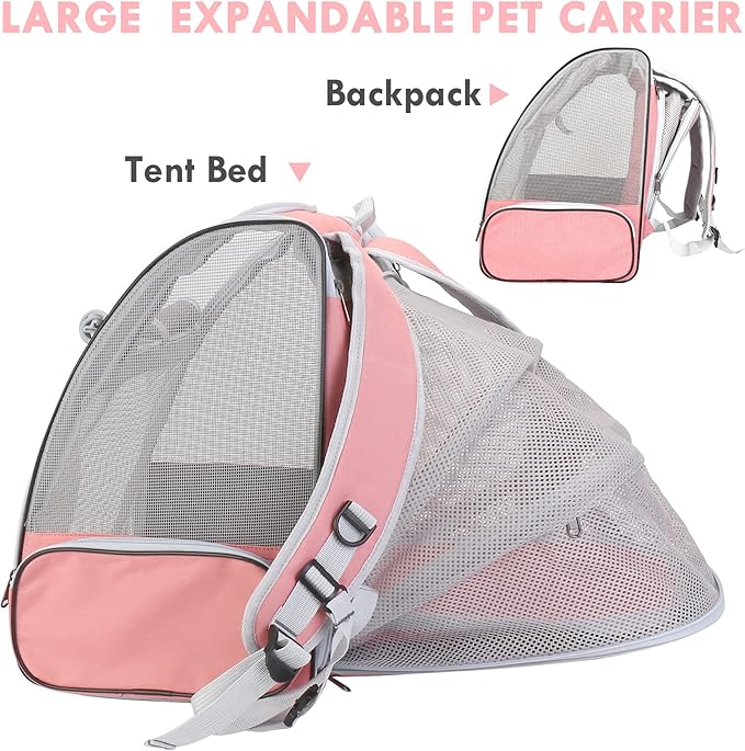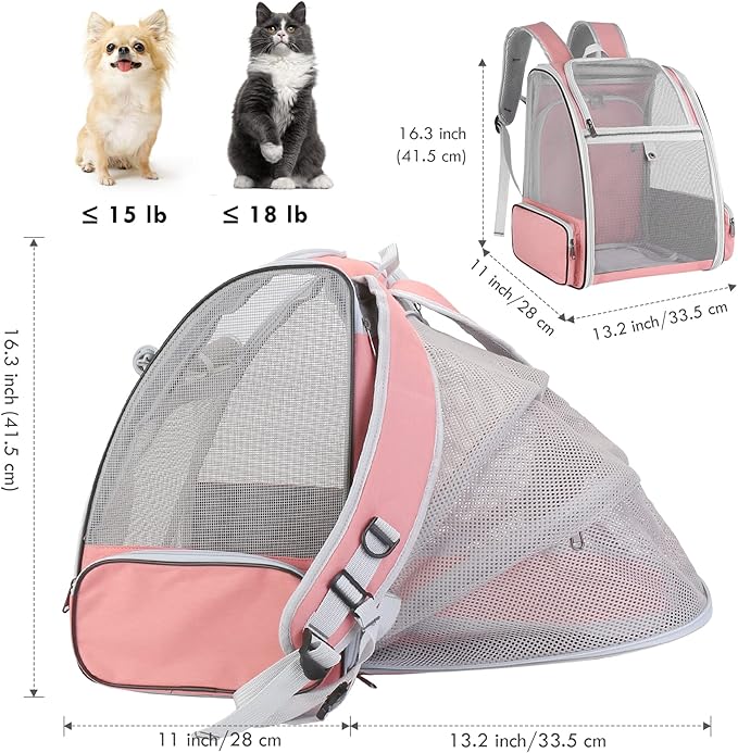 - Large & Expandable: Measures 13.2'' L x 11'' W x 16.3'' H. Perfect for dogs up to 15-pounds, or cats up to 18-pounds. The back panel of pet backpack can be expaned to be a giant tent bed for your furry friends to enjoy outdoor time and alleviate anxiety.
