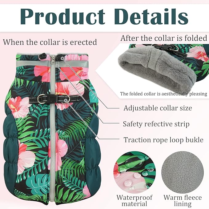 - Adjustable Collar: When you need to attach a leash to your dog, you can fold the collar of the dog fleece jacket. The inside of the collar is warm and beautiful. The furry collar can add to the overall beauty of the dog fleece vest