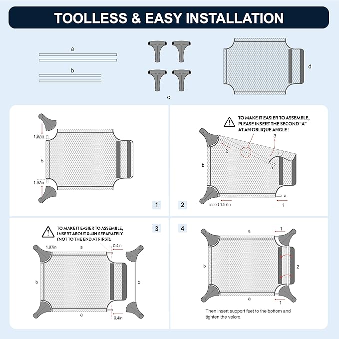 - Easy to Assemble: No screws or other tools needed. The dog bed can be easily and quickly installed only by insertion. It is recommended to carefully read our installation instructions and follow the steps before installation.
