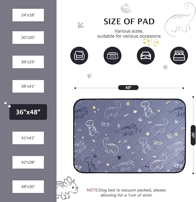 - 【Fashion and Non-slip】 Our dinosaur design makes this reusable pee pads for dogs very cute and makes your room more stylish. And the soft and comfortable puppy pee pads with anti-skid bottom can achieve a certain fixed effect.The bottom is waterproof and you can place it anywhere you want.