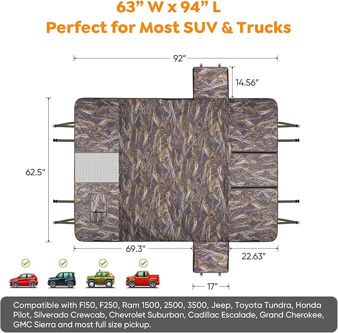 - Special Dog Floor Hammock Design: KIMHY camo dog hammock special designed with side flaps & ultra large of 63" W x 94" L. Provide full coverage for your car back seat, back of front seat, floor & doors, protect them from dirt,liquid, paws, stains, mess and scratches. Always Keep your vehicles tidy and neatly. Fits great for SUVs and trucks such as: crew cab 2012 ram truck,2022 RAM Quad Cab pickup, F-150 Crew Cab and other full size SUVs and full size extended Cab trucks, all pets below 150 lb