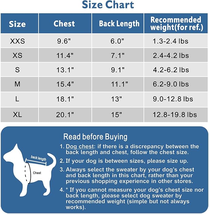 - Check your puppy’s sizes especially the chest and back length so as to select the right dog sweatshirts. Size Up if between sizes.