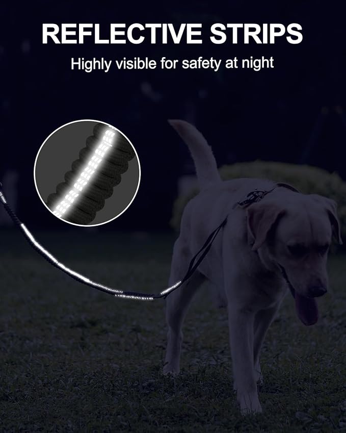 - Shock Absorbing Bungee Leash: This bungee dog leash allows just enough length for the dog to wander and explore while we’re walking but not so much that the leash drags on the ground. The springy design of the leash really absorbs the pull from large energetic energetic and strong dogs without tugging on your wrist and shoulder. It has a good stretch to ease the pressure for both the owner and the dogs to make your walks much more enjoyable