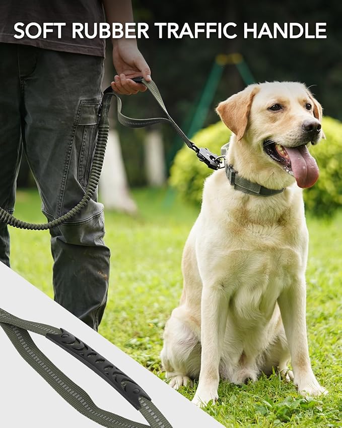 - Comfortable Double Handles: Our tactical dog leash is designed with 2 different comfortable handles. The Padded handle adding to the comfort at the end of leash for large dogs that pull is more suitable for your daily dog walking. The soft rubber traffic handle is more suitable for busy sidewalks, bike lanes, and crowded areas in order to close control of your dog