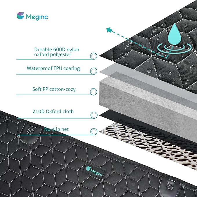 - 【STURDY MATERIAL】: HEAVYDUTY! HEAVYDUTY! HEAVYDUTY!Meginc dog back seat cover is made of 600D Oxford cloth, 100g soft PP cotton, 210D polyester fabric, 100% waterproof TPU and PVC anti-slip mesh. A thick pet seat cover can mitigate the damage of your vehicle and protect carpet, upholstery from unpleasantries such as dog hair, urine, or vomit, moreover our protectors also providing a familiar, comfortable and safety space for your pets during the road travel.