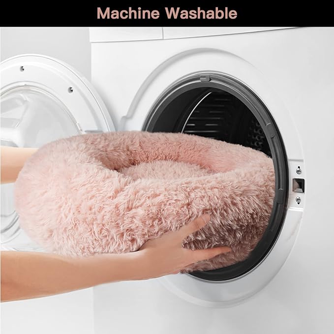 - 【Machine Washable】This cute plush dog bed can be whole washed by washing machine. Please machine wash the whole dog donut bed for large dogs separately with cold water in a gentle cycle, then tumble dry low and pat to make the pink calming dog bed completely fluffy before use.