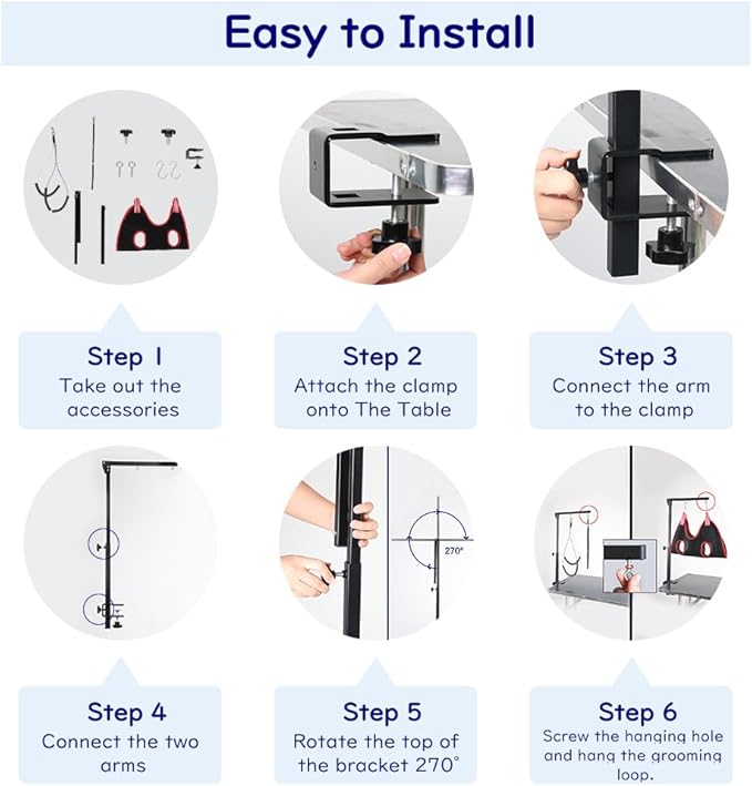 - PORTABLE & EASY TO INSTALL: Our pet grooming holder adopts foldable design to save space and easy to store with ease. All you have to do is installing the grooming arm by attached knob and clamp, and rotate the arm 270 degrees to get a durable grooming arm, only 1-3 minutes needed. * Pet grooming arm set only, table not included