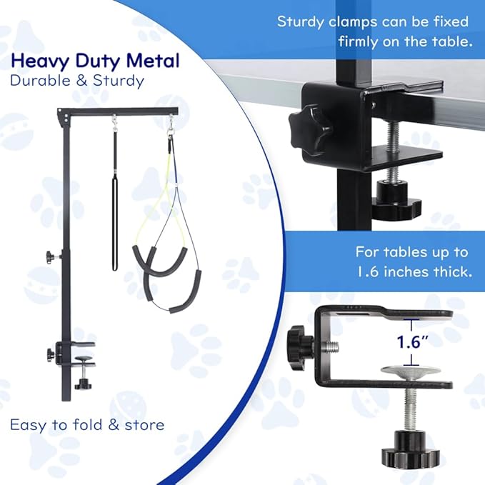 - HEAVY DUTY METAL MADE: Our dog grooming table arms are made of high quality metal, with a spray-painted surface that is waterproof and not easily scratched. Connected by tension knobs, it ensures that the pet grooming arm is securely fixed to the table, sturdy & durable. The clamps are also made of heavy duty metal and are more stable than plastic ones