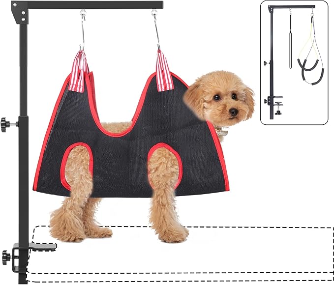 - PET HAMMOCK & NOOSE: Our dog grooming arm for table comes with 2 no sit haunch holder (21 inch and 25 inch) and 1 dog restraint rope (21 inch) and 1 comfortable hammock harness (20 inch). They can keep your pets' heads and buttocks firmly on the grooming table, which not only prevent pets from getting too excited to move around, but also keep pets more comfortable