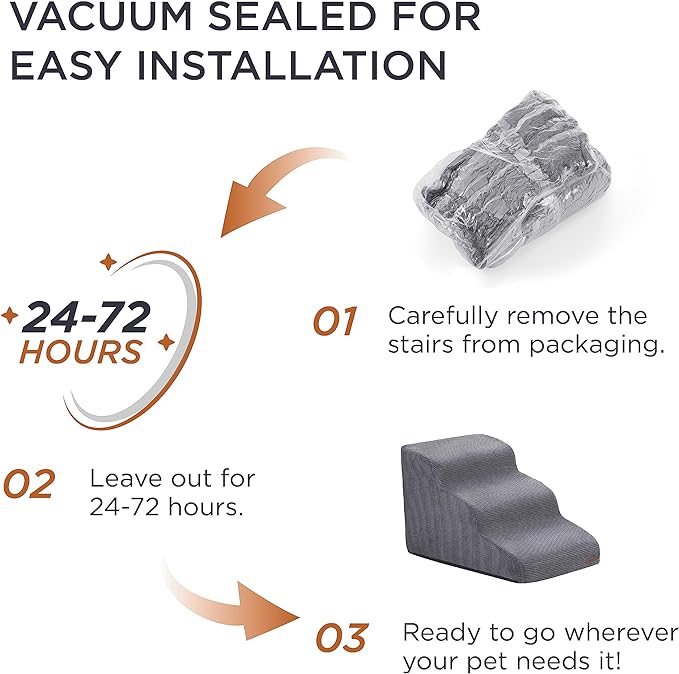 - Convenient & Easy to Use: Thoughtfully designed with your furry friend's needs in mind. A non-slip bottom featuring rubber dots ensures secure footing, while the handy built-in handle allows you to effortlessly move the ramp as needed. Note: the ramp arrives vacuum-compressed and requires no assembly. Simply give it 24-72 hours to fully expand and offer the utmost comfort for your pets.