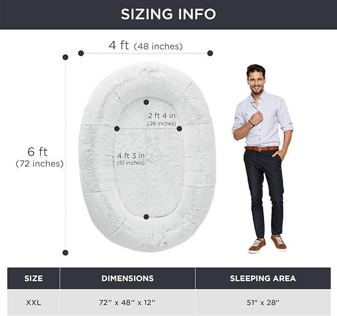 - Orthopedic Support for Superior Comfort: Experience dreamy, restorative sleep with our therapeutic human dog bed. It features soothing and warm faux shag fur supported with a layer of memory foam and a layer of high-density support foam. This innovative combination distributes weight evenly, providing optimal pressure relief and joint support for you and your pet.