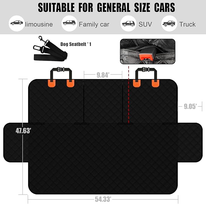 - 【COMPREHENSIVE PROTECTION】Our dog car covers wrap around the rear seat and sides, protecting the entire space from mud, fur, paw marks, and other damage! You can also secure the seat belt through the provided slot or open the central zipper to make room for the armrest.