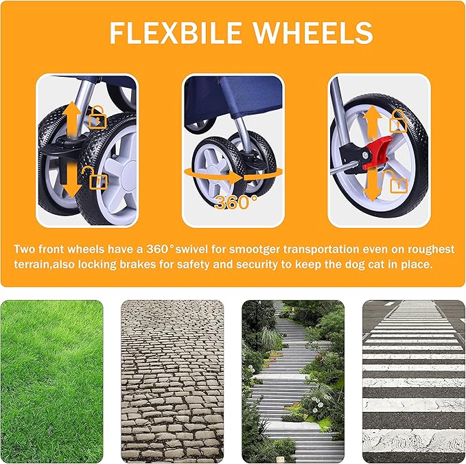 - 【Fit for Kinds of Terrain】After the button of the front wheel is pressed, pet stroller only keeps moving forward. When the button is lifted, the front wheel can turn 360°, the four large tires are more stable and can adapt to various terrains.