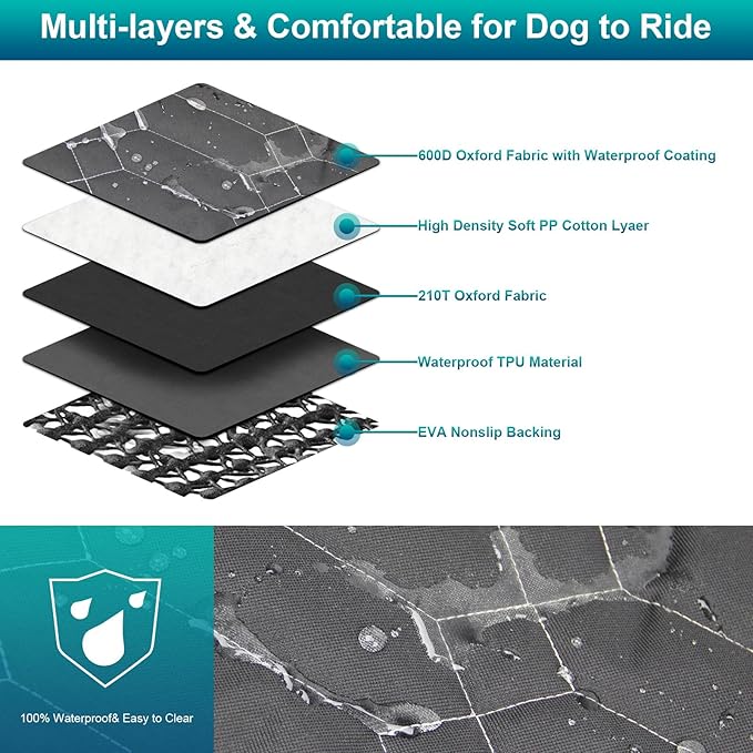 - Durable and Waterproof Material: Our dog car seat cover use 600D3*3 oxford encrypted fabric with waterproof coating, better wear resistance.Under the PP cotton filling layer, a layer of TPU waterproof material is added on 210T Oxford fabric to achieve double waterproof.