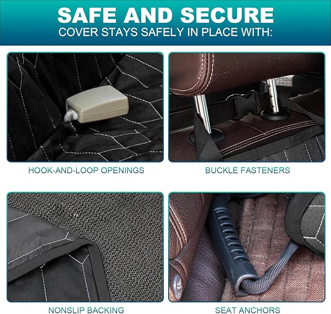 - Bidirectional Protection:4 heavy-duty headrest anchors and 2 seat anchors keep this dog car seat cover for back seat completely in place, so your pet doesn't slip and slide around.It can keep your car seats free from pet hair, mud, and scratches.