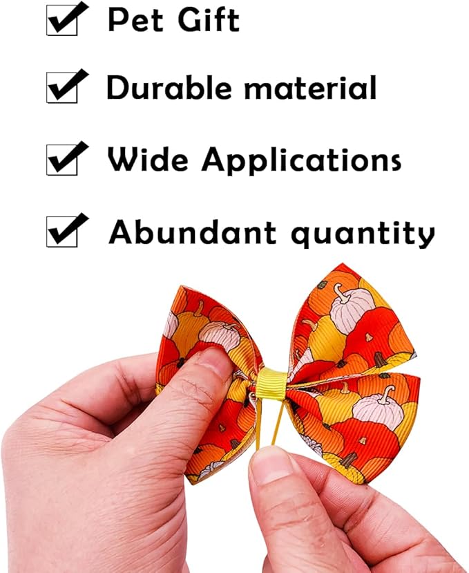 - Dog hair bows fall : These dog hair bows are designed with the patterns of autumn elements maple,pumpkin, harvest,leaves,forest and autumn berries. the different colors will be assorted randomly for boys and girls. They will make your pets look more fashionable and attractive.