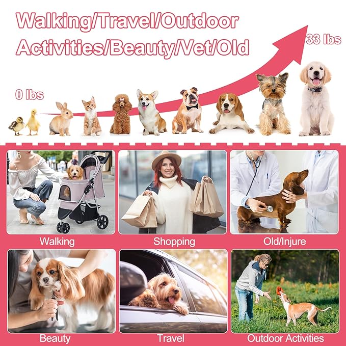 - 【Durable Materials】Our pet stroller is made of high quliaty steel frame, which can hold small and medium dogs and cats up to about 33 lbs. Equipped with a durable mesh for airflow and visibility, as well as premium oxford cloth that is bite-resistant and scratch-resistant and water-resistant.