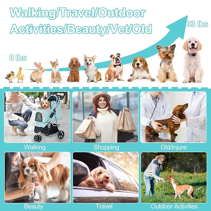 - 【Durable Materials】Our pet stroller is made of high quliaty steel frame, which can hold small and medium dogs and cats up to about 33 lbs. Equipped with a durable mesh for airflow and visibility, as well as premium oxford cloth that is bite-resistant and scratch-resistant and water-resistant.