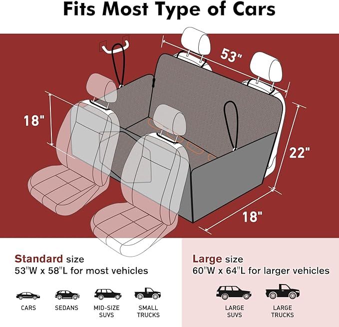 - [5 in 1 Multifunctional Dog Seat Cover, Universal Size for Most Cars] Our car cover back seat protector is a versatile accessory that functions as a ①dog hammock with side wings ②bench car seat cover ③trunk cargo liner ④dog seat style ⑤camping mat. The size of 53"W x 58"L, making it perfect for most cars, including limousines, family cars,and SUVs. It covers the entire back seat for ultimate protection, ensuring hassle-free rides and worry-free family excursions.