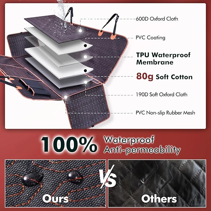 - [100% Waterproof & Scratchproof & Durable] Crafted with 6 layers of durable cloth, our Donlinno backseat dog cover is designed with two waterproof layers for ultimate protection. It features a unique 600D oxford fabric with a water-resistant coating that achieves 100% waterproofing. Our cover also includes heavy stitched seams to prevent rips or tears from dog claws, ensuring long-lasting us.