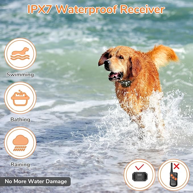 - Extended Range and IPX7 Waterproof: The dog training collar with remote provides an impressive range of 1500 feet, allowing you to maintain control and effectively communicate commands in outdoor settings. With the IPX7 waterproof rating, the shock collar with remote is fully submersible, making it suitable for training sessions in various weather conditions and even water activities.