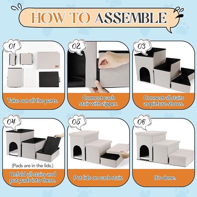 - PORTABLE&EASILY ASSEMBLE-Every two neighboring stairs are connected by the zipper shared with one another, put pads at the bottom of the stairs and then put lids over it. If you wanna pack pet steps for cats in the suitcase or store it, do it reversily in the order of assembly and it won't take you more than 5 minutes.