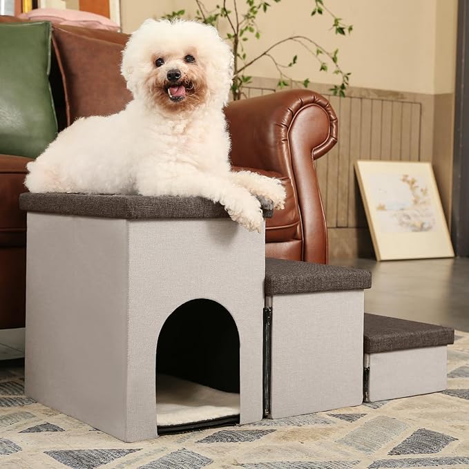 - MULTIFUNCTIONAL PET STAIRS-The pet stairs for small dogs can not only be used as climbing tools for high beds and couches, but also storage boxes for pet toys, grooming tools,etc. If the pet stairs for high beds is not in use, you can disassmble it easily without taking over space. Besides, condo with sherpa cushion on the highest stair would be a warm nest for your pets and wonderful pet steps for cats.