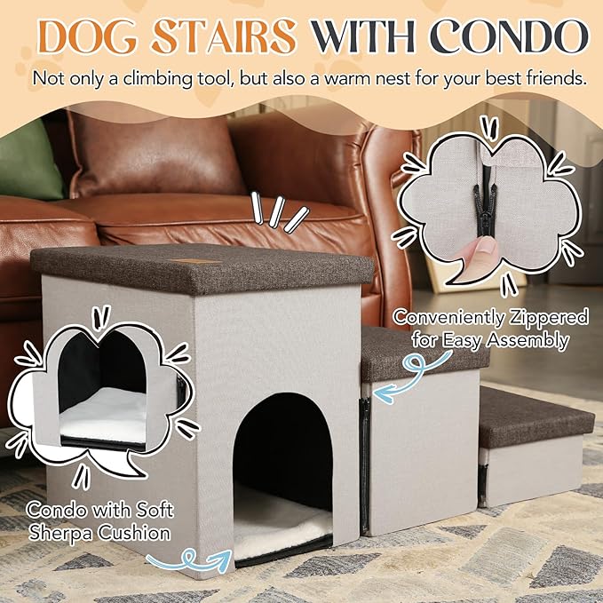 - STABLE&SAFE&SWEET-Our pet steps for bed small dogs feature non-slip rubber bottom to keep the stairs stable when pets climbing. The lids are made by high-strength medium density fiberboard and there are deformation resistant pads underneath to ensure the whole stairs not to fall apart. For the condo, we have extra soft sherpa cushion prepared for comfort.